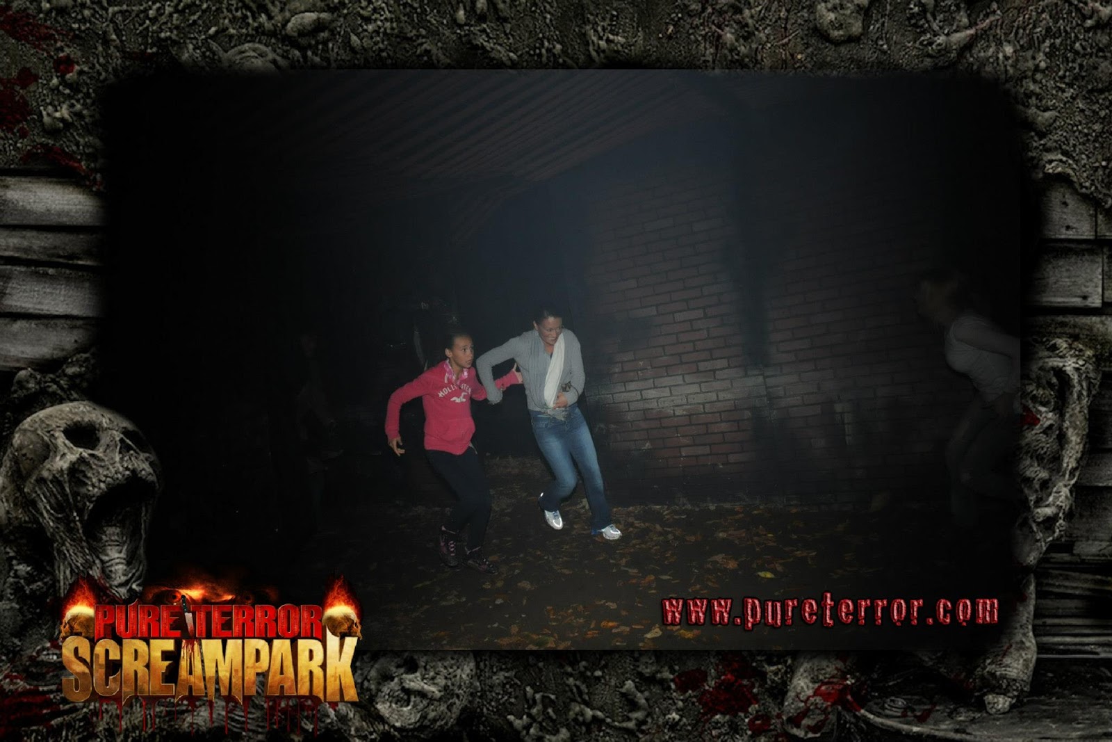 Now below are some pictures from my job... the first one I'm on the right in the corner, with the white shirt on and ripped blue jeans. You can't see my face, but its all kinds of twisted makeup lol The second is one of my co-workers who is in the same room as I am. He uses a chainsaw to scare the crap out of people!